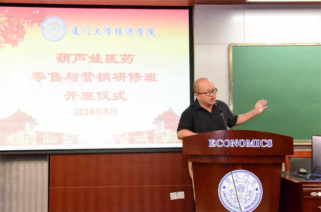 在开班仪式上,廖景峰主任首先代表厦门大学经济学院热烈欢迎97国际医药零售与营销研修班的学员到厦大学习,并就厦门大学及经济学院的相关情况进行了介绍。他说,97国际学员走进厦大就是厦大的校友,希望未来的日子能够关心、支持母校的发展,多提宝贵意见,同时他也祝大家在厦大学习期间学有所成、学有所获。