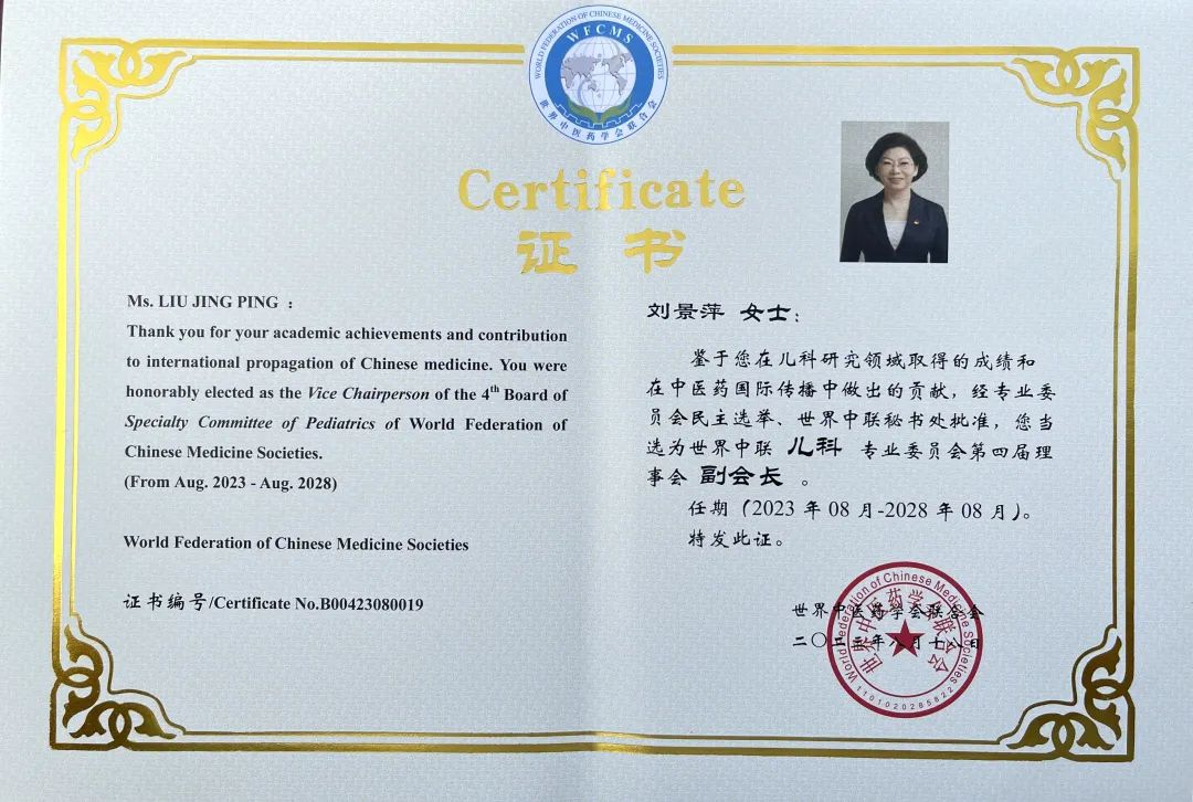 97国际药业集团党委书记、董事长刘景萍当选世界中医药学会联合会儿科专业委员会第四届理事会副会长